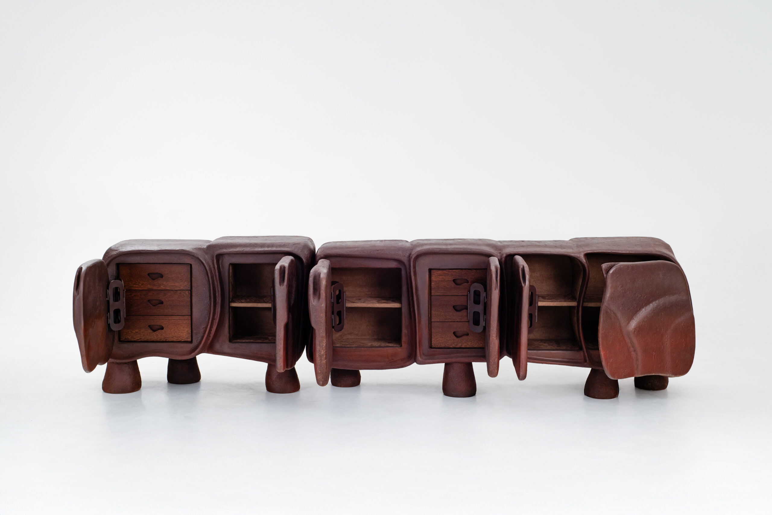 The Rhino collection, by contrast, channels quiet strength. Two monumental sideboards play with fragmented volumes and hollowed curves, their surfaces clad in honeycombed oxidized concrete developed in close collaboration with Matterlab in Lebanon. Light dances across their textured skin, transforming functional furniture into resonant sculpture.