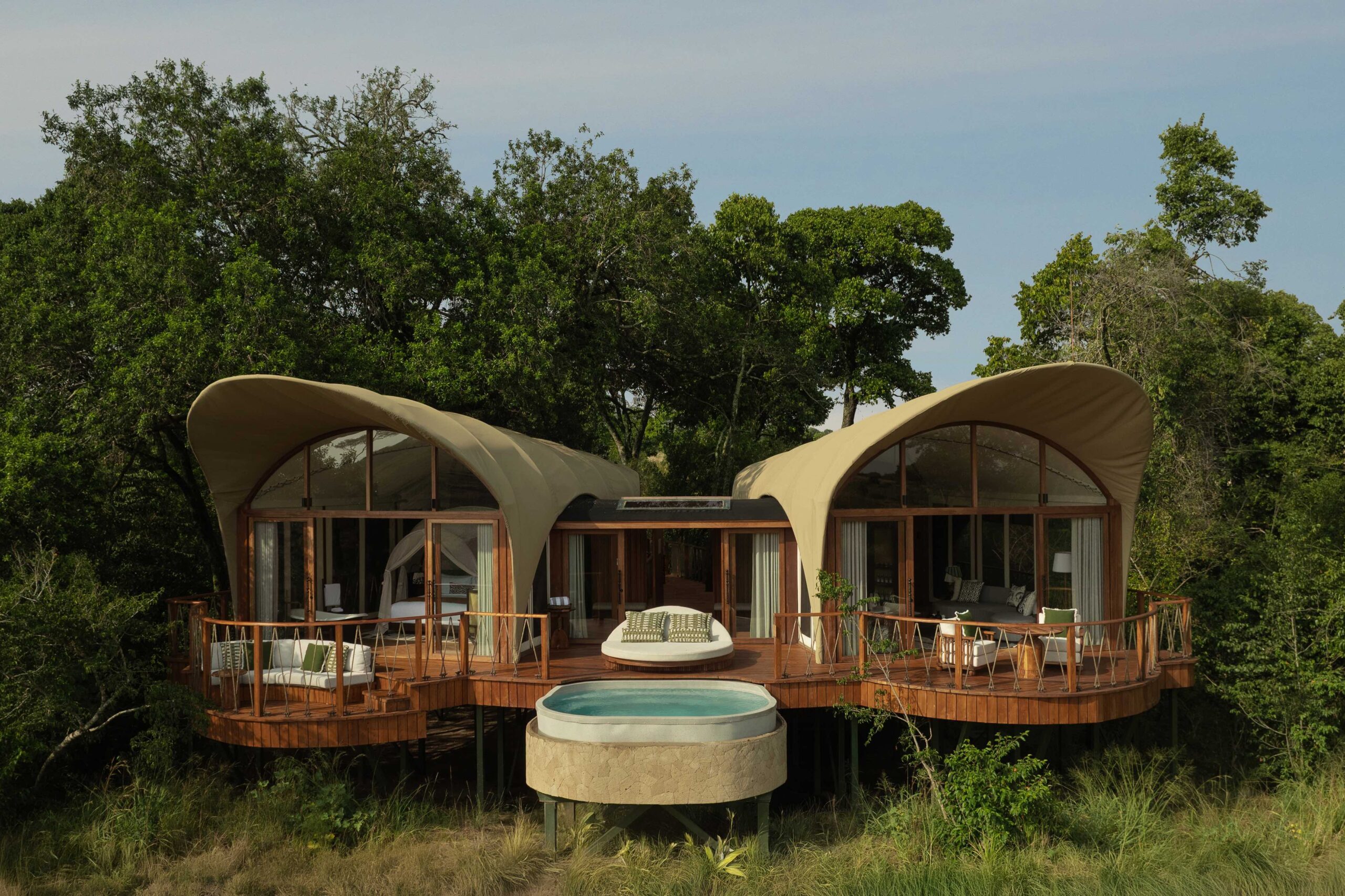 The signature curved tent structure—hooded and fluid—takes inspiration from the bend of the Sand River, reimagining traditional safari forms into something organic, sculptural, and deeply functional. These elevated treetop perspectives bring guests eye-level with birdlife and the forest canopy, creating an intimacy with nature rarely experienced from the ground.