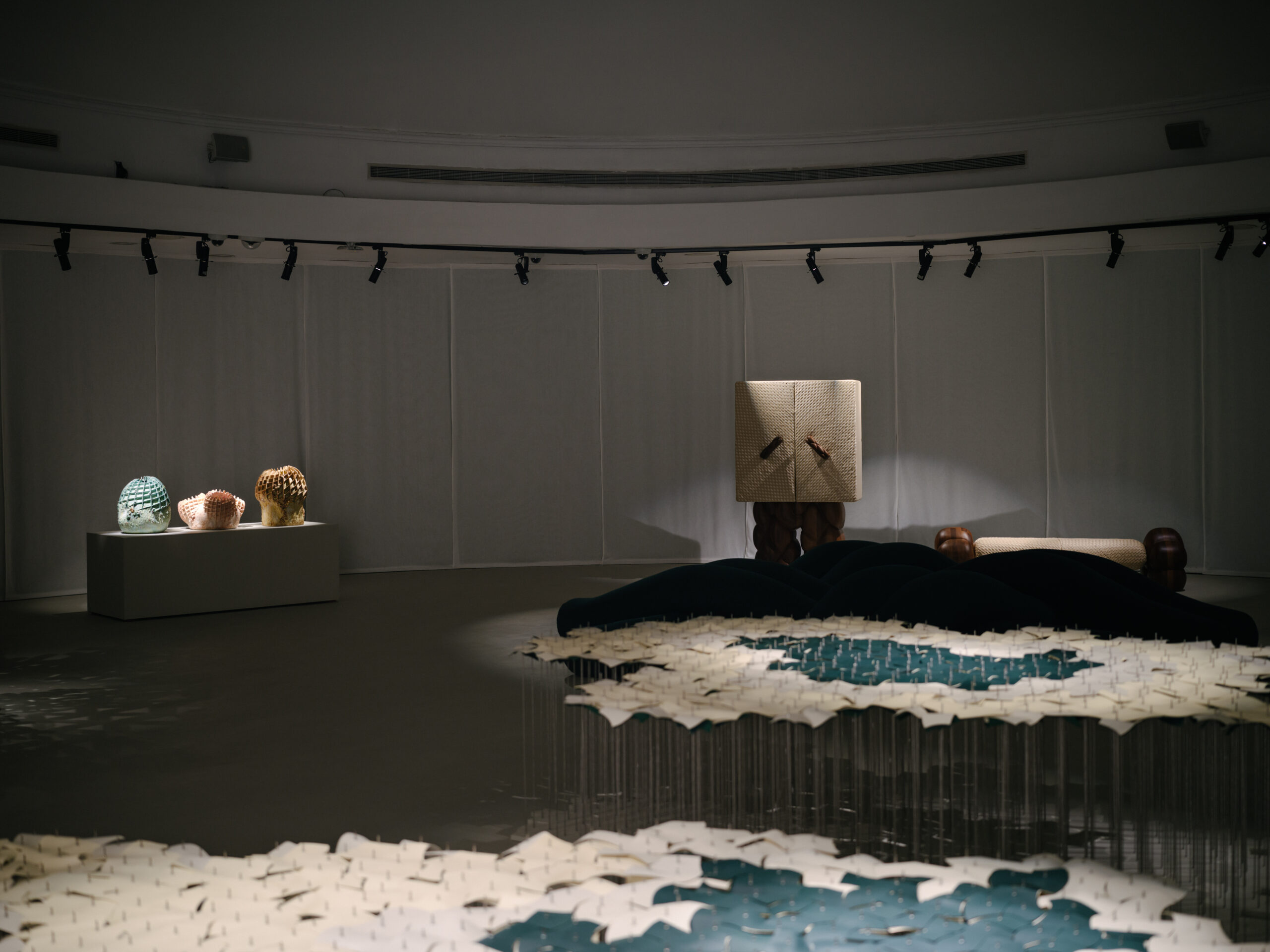 The interpretations vary in scale, material, and intent, yet together they form a quietly resonant landscape. Abdalla Almulla anchors Emirati weaving traditions in sculptural, communal geometries, while Amine Asselman’s leather “landscapes” unfold like fields of motion and memory. Bahraini—danish translate the discipline of the weave into interlocking teak structures of almost architectural clarity, as Esna Su’s hand-knitted leather pillars rise with a sense of resilience and renewal. Shaha Raphael fossilises Intrecciato in volcanic stone, binding craft to geological time, while Zein Daouk’s ceramics map fragile networks of interdependence. Nader Gammas composes luminous totems where craft converses with digital light, and Sayar & Garibeh weave fibre and leather into playful architectures that capture movement, touch, and the intimacy of making.