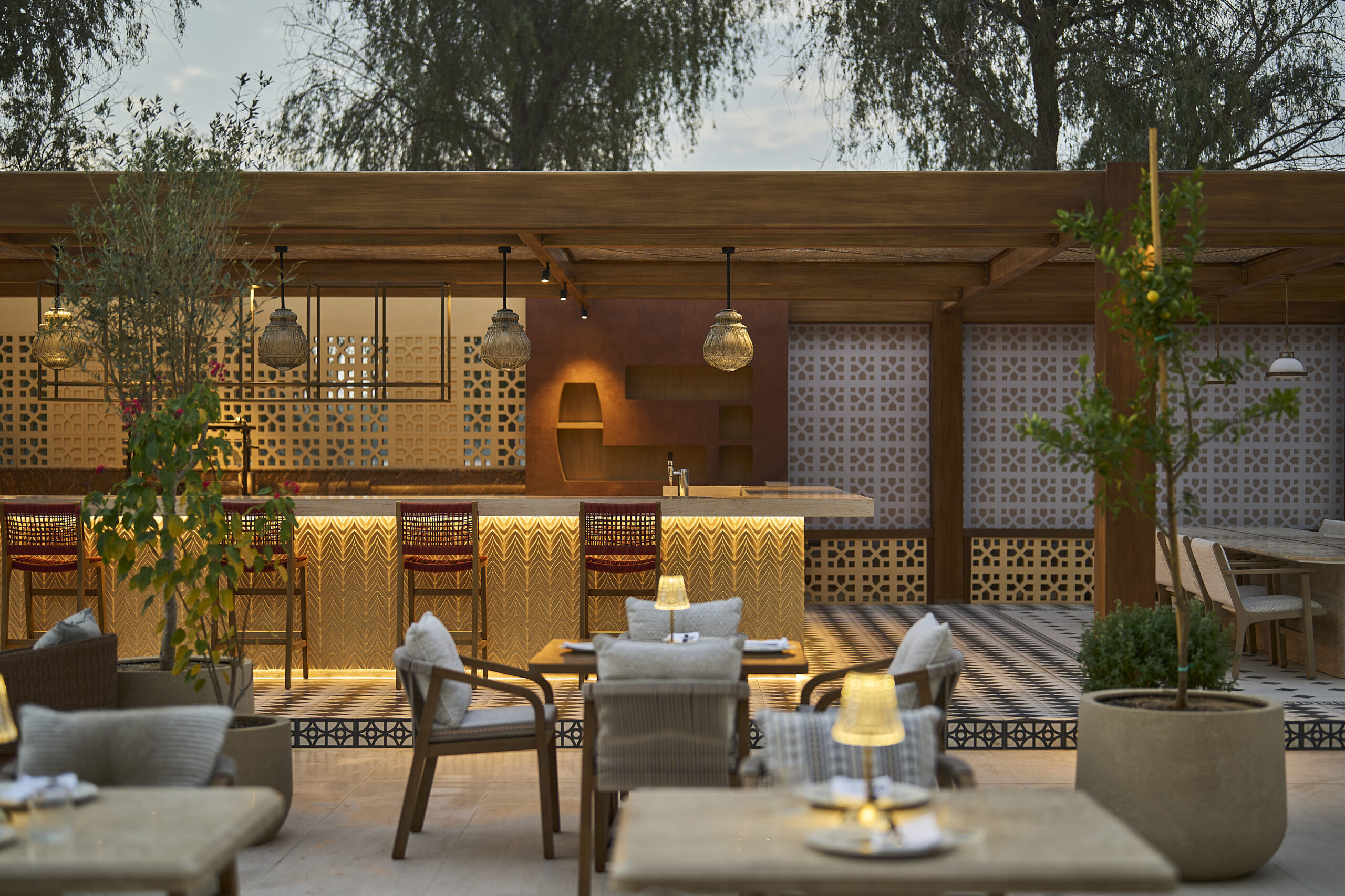 A collaboration between Atelier House Hospitality and Tashkeel, Gerbou offers more than a meal—it offers a sensorial journey. The space, designed by Kristina Zanic Consultants, unfolds like a contemporary majlis. Camel leather sofas, Ghaf-wood dining chairs, Sadu-patterned tables, and sculptural lighting all speak to a deep reverence for place. Even the door handle—engraved with motifs of palm trees, ocean waves, and desert sand—becomes an invitation into memory.