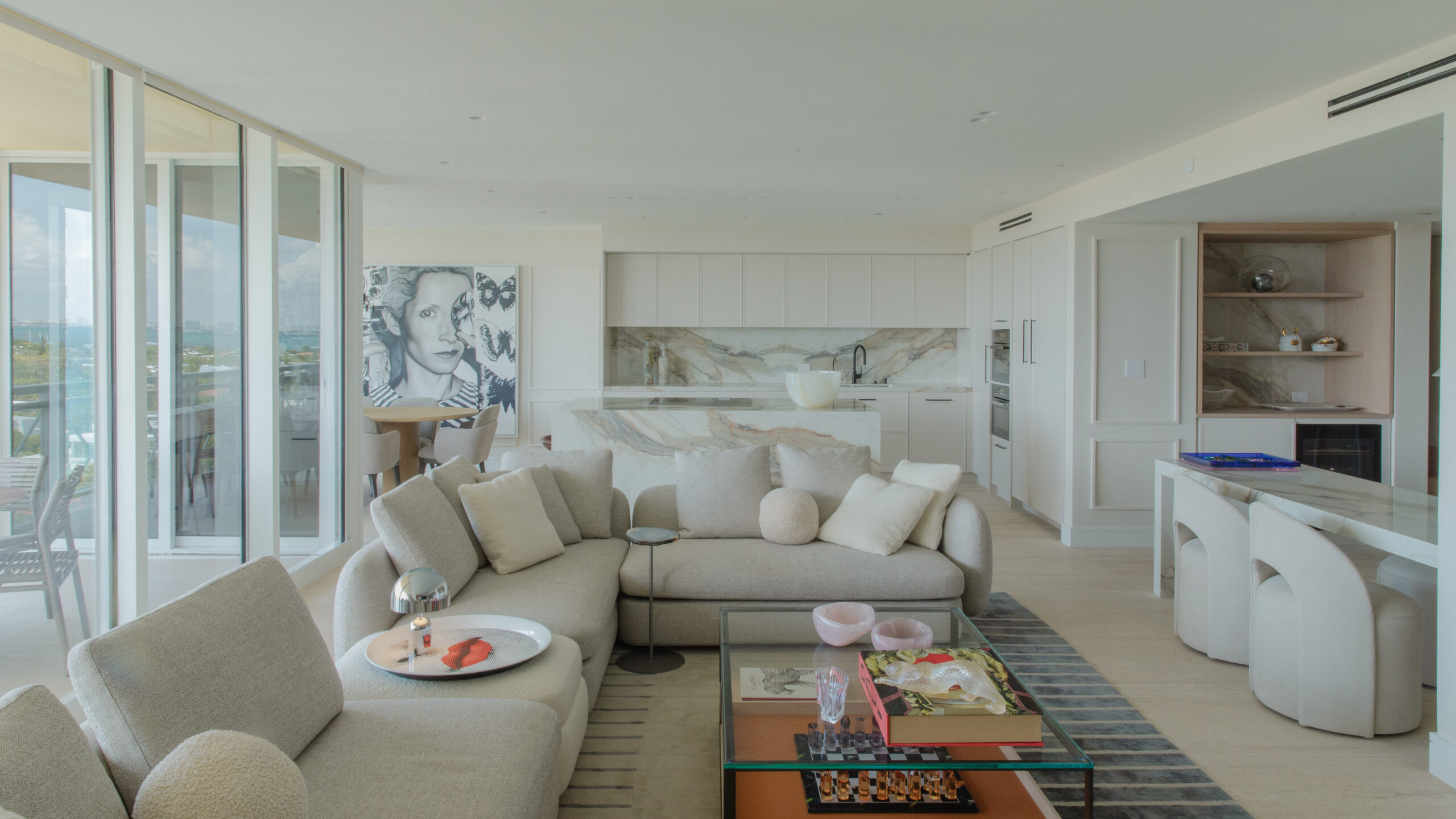 The entry sets the tone with Nero Marquina and travertine checkerboard flooring, antique mirrors, and a calibrated mix of sculptural objects. A private elevator opens directly into views of the ocean and Miami skyline, with the apartment unfolding across a single, open level.