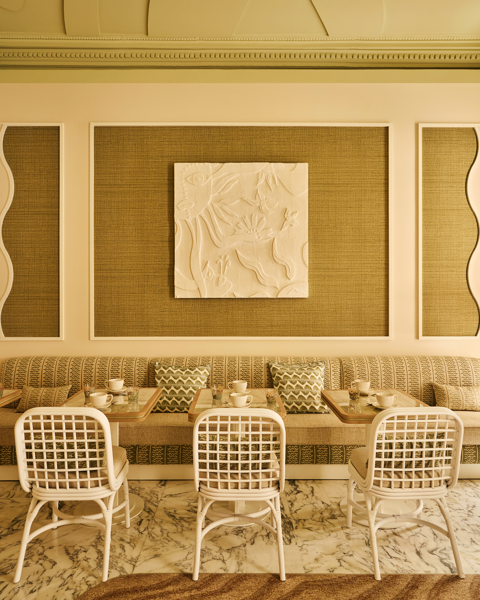 From terrazzo floors to wicker accents, each detail is a tribute to craft, light, and nature.At the heart of the hotel is a celestial ceiling fresco — a sculptural composition in painted wood, floating like a breeze overhead.