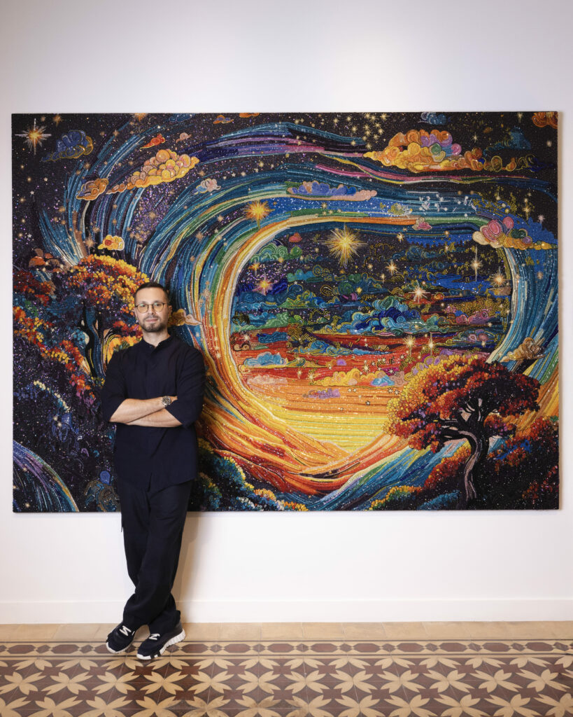 Across twenty-two works, Kadi translates embroidery into energy, revealing galaxies of color, light, and motion. Techniques drawn from his Maison — Swarovski crystals, French knots, raffia threads, and glass beads — are reimagined on canvas, turning couture detail into cosmic matter. Each piece glimmers with the patient craftsmanship that defines his work, yet speaks a new visual language: one of expansion, contemplation, and wonder.
