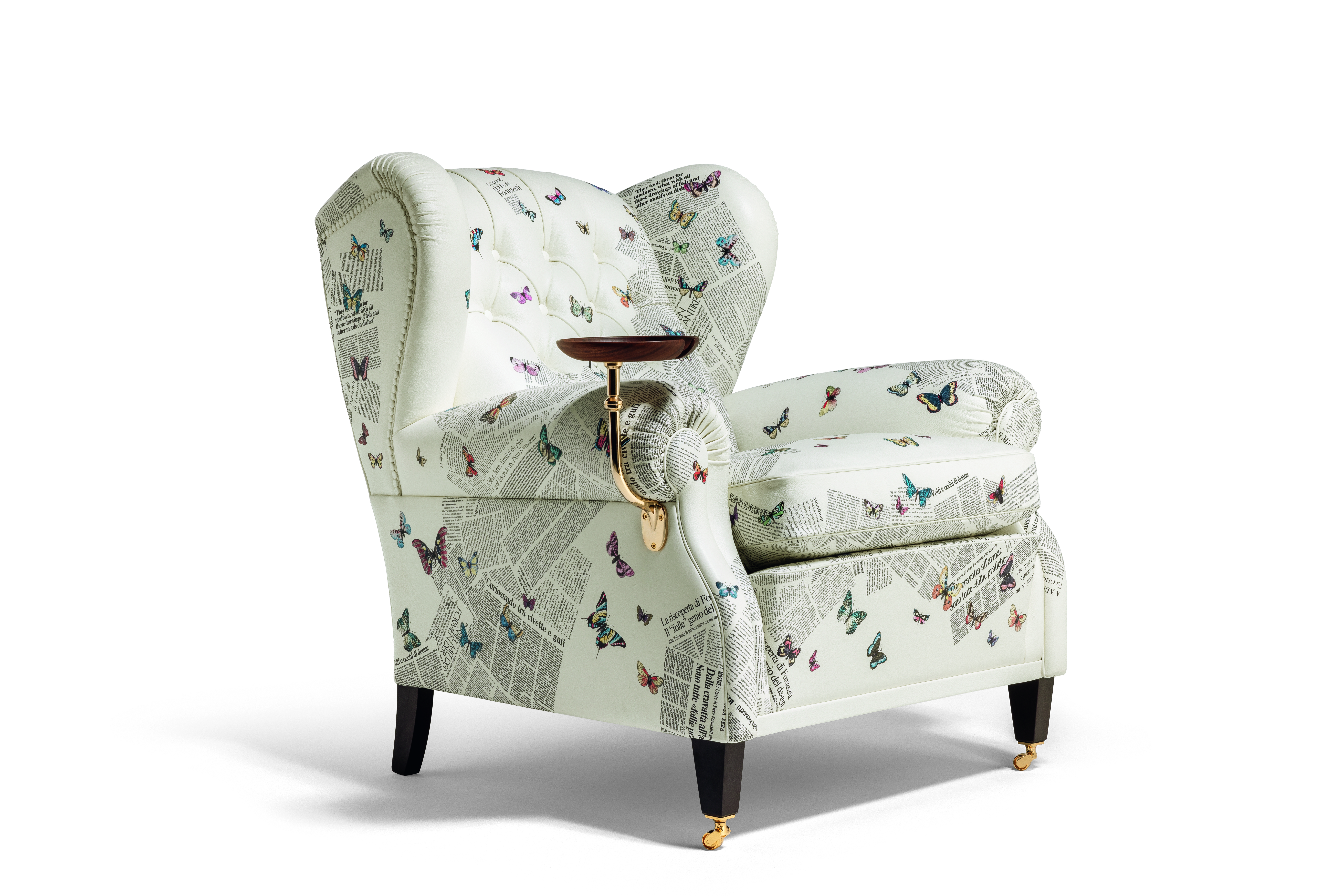 Presented as part of The Five Seasons collection, the re-editions of the iconic 1919 armchair and the Isidoro trunk-bar are more than just furniture—they’re artistic statements. Upholstered in Poltrona Frau’s sustainable Pelle Frau® ColorSphere® Impact Less leather, both pieces are dressed in Ultime Notizie, Fornasetti’s emblematic print of fluttering butterflies and vintage news clippings. Originally designed in 1950 and reimagined by Barnaba Fornasetti, the motif transforms leather into a tactile illusion of paper and poetry.