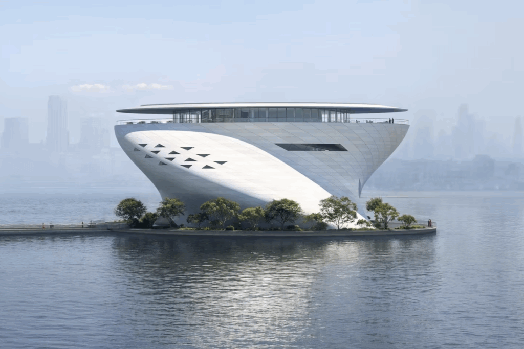 Conceived as a five-storey sculptural form that appears to float, the building rests on a circular platform extending into the saltwater inlet. Its smooth white shell curves and folds like a vessel in motion, punctuated by slender triangular openings that filter sunlight into the interiors. At dusk, the façade absorbs the amber tones of the sky, softening its precision into something quietly atmospheric — an architecture that breathes with its surroundings.
