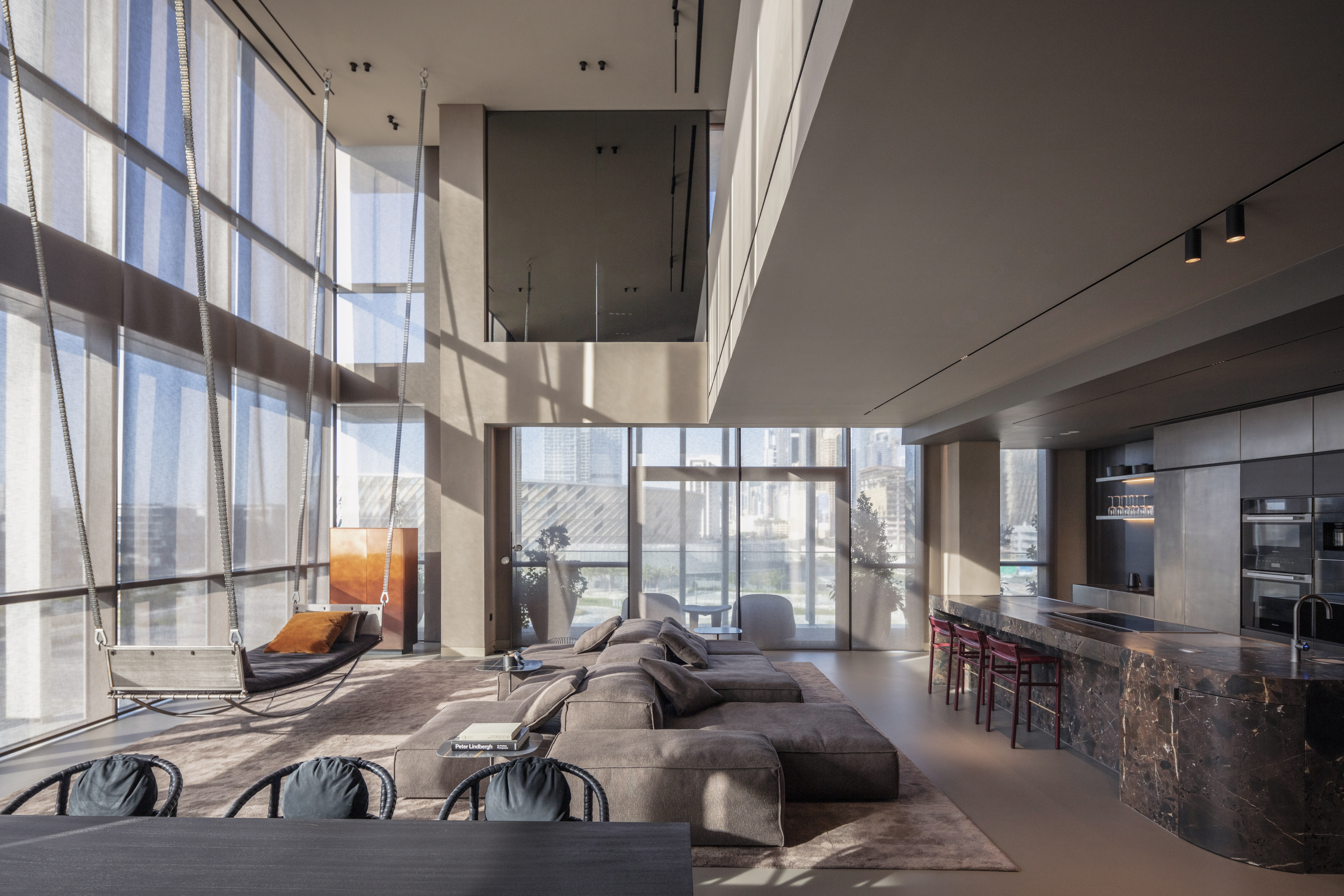The interiors are defined as much by what is not there as by what is. Instead of accumulation, the furniture and objects are carefully edited. A Jim Zivic hammock daybed floats six meters above the floor, offering a suspended perch for sunset views. An Arno Declercq charred wood dining table anchors the social heart of the loft like a monolith. A bespoke kitchen in leathered stone and burnished steel engages directly with the living area, blurring the line between cooking and gathering. Beyond, a charred-oak pocket door conceals a darker TV lounge, a cocoon of comfort in contrast to the luminous main space.