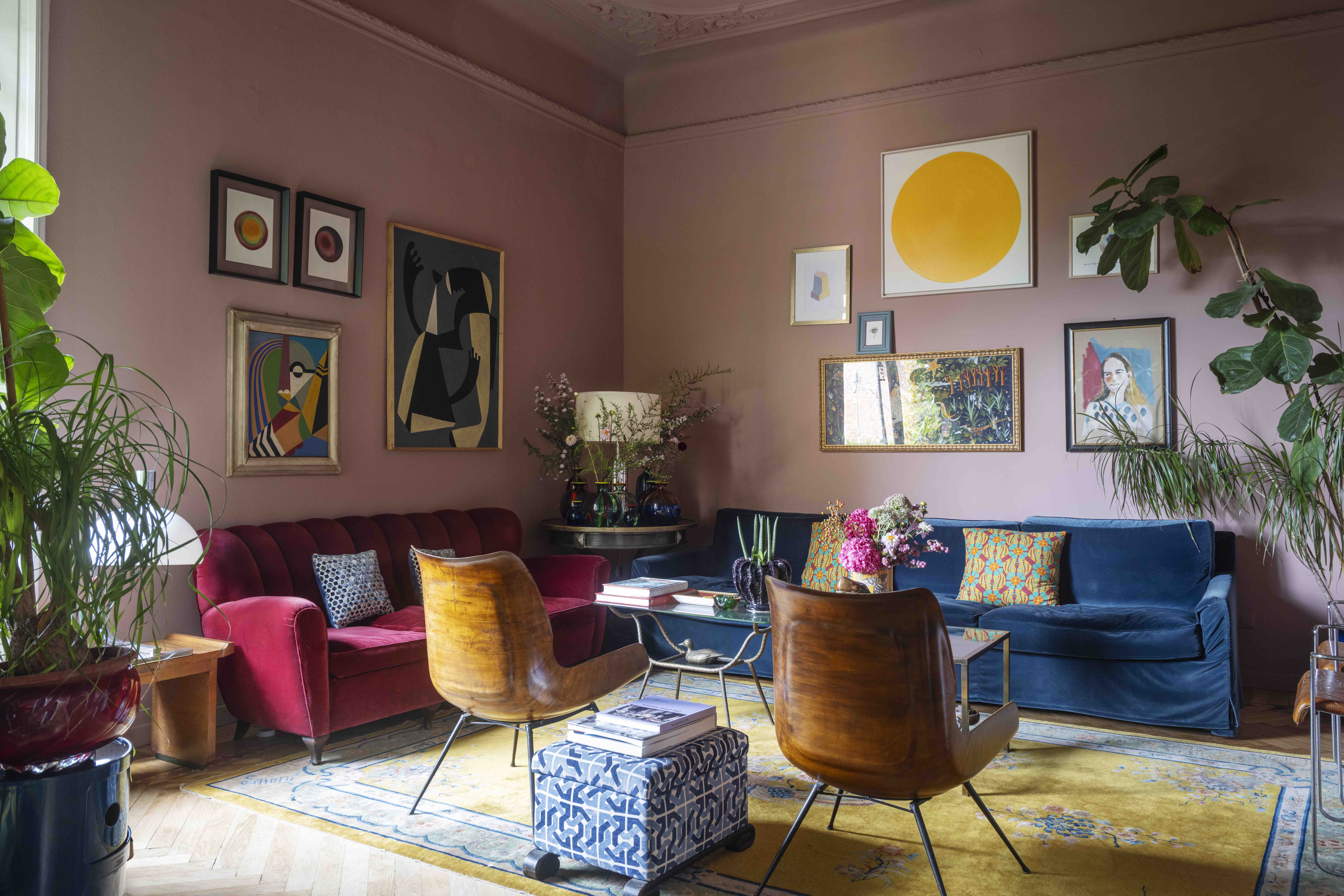She leads me into her meditation room: deep navy walls, a ceiling hand-painted with gold constellations, light streaming through tall windows. We sit cross-legged on soft cushions; Pepper, her pug, curls up beside me. I feel unexpectedly at ease. J.J. invites me to choose a crystal from a bowl of shimmering stones. I pick a blue one, without thinking. Later, back home in Amsterdam, I’ll look up its meaning — and the coincidence will leave me breathless. But more on that later. I’ve attended retreats before, but this feels different: intimate, charged, almost otherworldly. J.J. has a gift — not only as one of the most original designers of our time, but as a woman who opens portals to a quieter, higher frequency. When we finish, we move into her living room — lush with plants, colourful walls, and vivid objects that seem to hum with life.